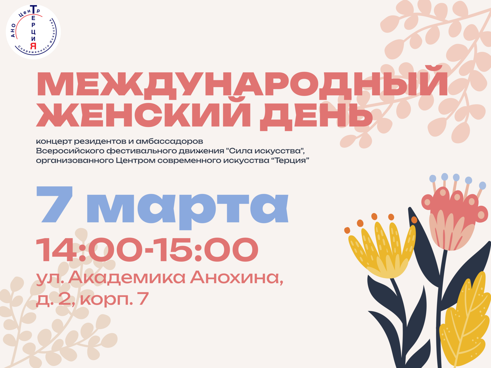7 марта с 14:00 до 15:00 в уютном Центре долголетия пройдёт праздничный концерт резидентов и амбассадоров Всероссийского фестивального движения «Сила искусства»!