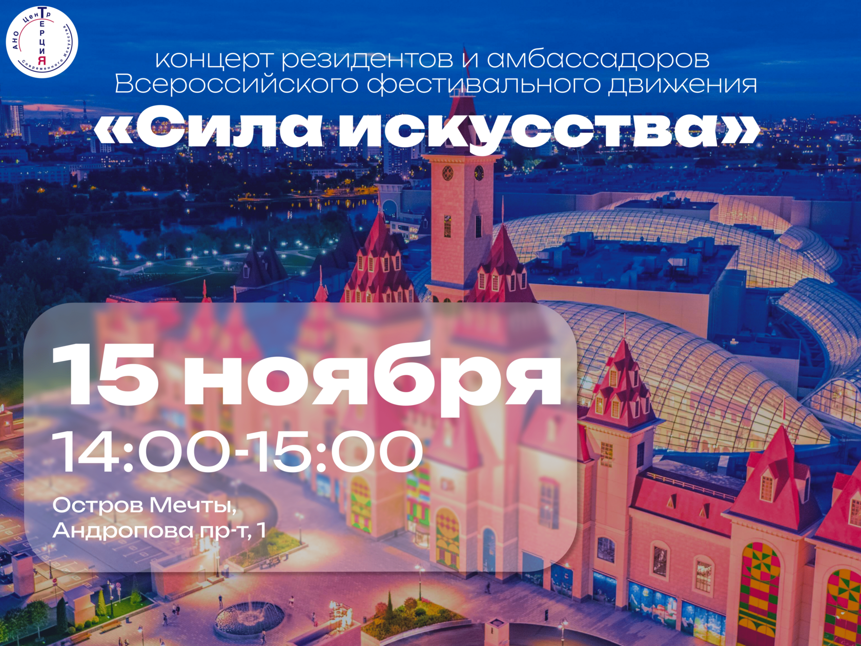 Дорогие друзья, приглашаем вас на концерт резидентов Всероссийского фестивального движения "Сила искусства", который пройдёт 15 ноября с 14:00 до 15:00 на территории комплекса "Остров Мечты" по адресу проспект Андропова, дом 1.